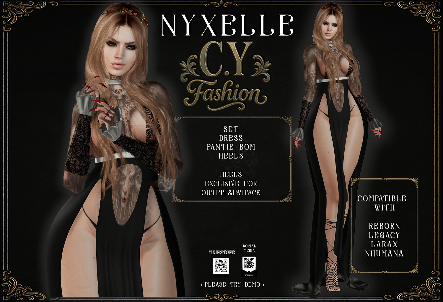 NYXELLE is a seductive gothic dress with bold cuts, lace details and a haunting silhouette, perfect for a noir Christmas night where beauty meets temptation.