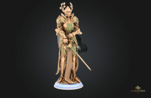 This statue depicts a Templar knight in full armor, standing upright with his hands resting on the hilt of a large sword pointing downward. He wears a flowing cloak and a white tunic adorned with a red cross — the emblem of the Knights Templar. His solemn stance and calm expression convey strength, honor, and unwavering faith.
