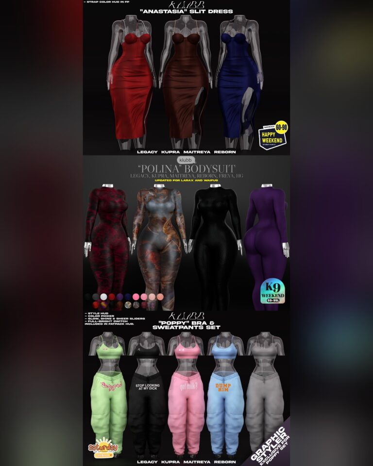 Klubb. Weekend Sales Klubb Klubb x Weekend Sales 💗 Visit our NEW flagship location with all our previous releases. ➟ ⭐️ COMPATIBLE with Legacy F, Kupra, Maitreya Lara, and Reborn⭐️ “Anastasia” Slit Dress Set for Happy Weekend ➟ ⭐️ COMPATIBLE…